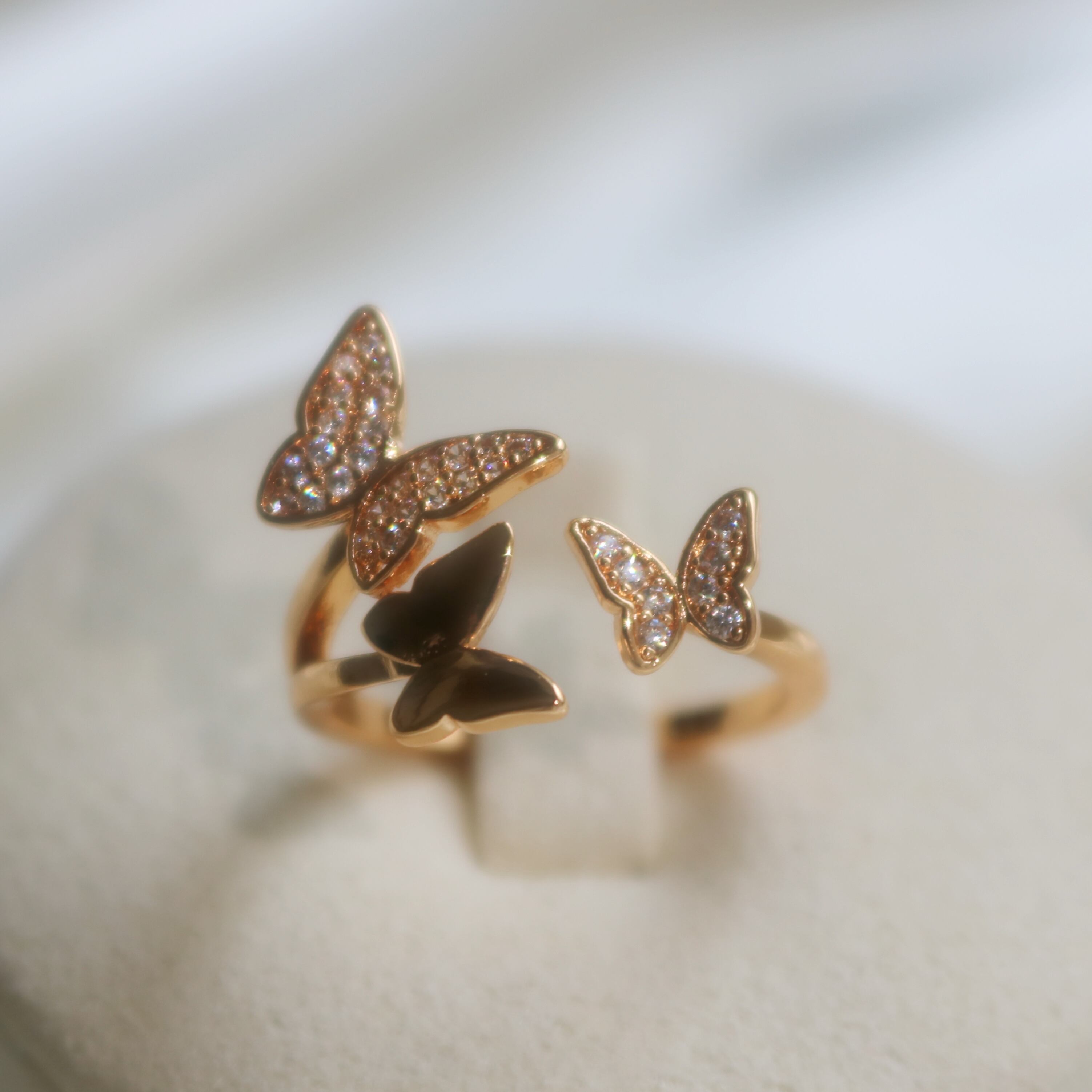 キラキラと蝶々が輝く、サイズ調整が可能なバタフライリングです。 サイズ:フリー カラー:ゴールド 素材:コッパー